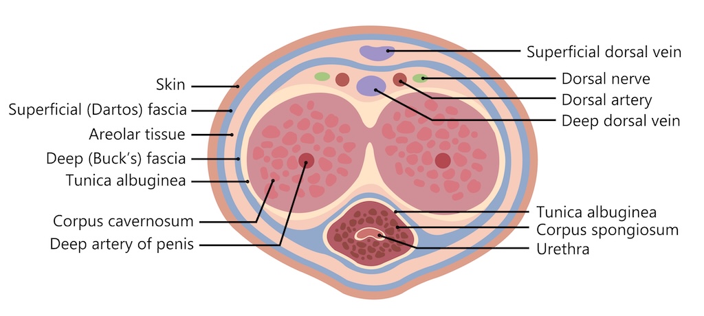 Tunica albuginea er den stærke, fibrøse “kapsel” rundt om svulmelegemerne. Den fordeler trykket ved rejsning og holder blodet inde. Fortykkelser eller arvæv (peyronies plaque) her er kernen i Peyronies sygdom og kan give krumning, smerte, ondt i svulmelegmerne, timeglasform og tab af stivhed. Udenpå ligger Buck’s fascia, som binder strukturerne sammen og beskytter kar og nerver.